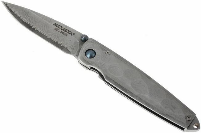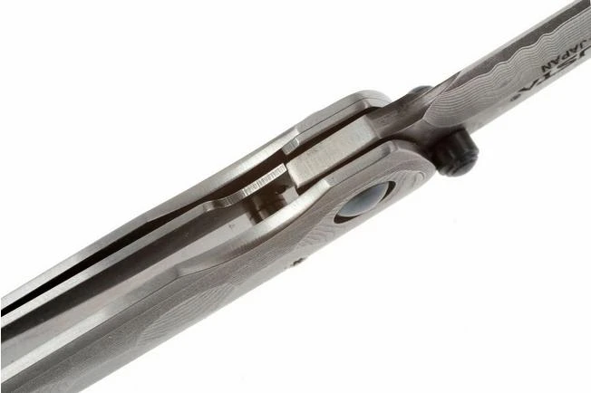 The Mcusta MC-34D Shinra Tsuchi is a fancy gentleman’s knife. The handle of the Tsuchi 34D is made from damascus steel with a stunning finish. The surface is enhanced with a pattern which you could call a coarse hammer finish. It is pleasant to the touch and causes a light refraction that showcases the pattern of the damascus steel even more clearly. The steel of the handle and the damascus steel of the blade fit perfectly together.