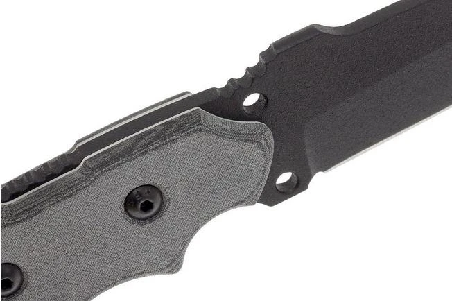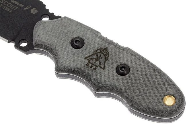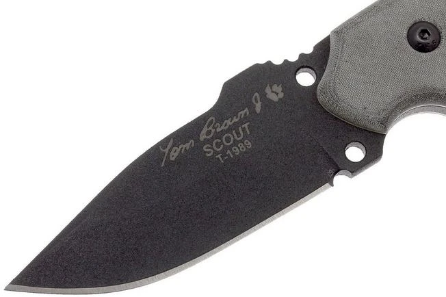 The TOPS Knives Tom Brown Tracker Scout is a very solid fixed knife. It is the ideal partner in addition to the Tom Brown Tracker . The big Tracker can be a bit large for finer work, but this Tracker Scout is ideal for smaller chores. When setting up camp the Tom Brown Scout is ideal. The 1095 carbon steel blade is razor-sharp and has black Traction Coating to protect it against corrosion and keep it from reflecting. The micarta grips have a subtle white liner. Micarta offers a lot of grip with dry or wet hands/gloves. The holes around the middle of the knife can be used to attach the knife to a stick so it can be used as a spear.