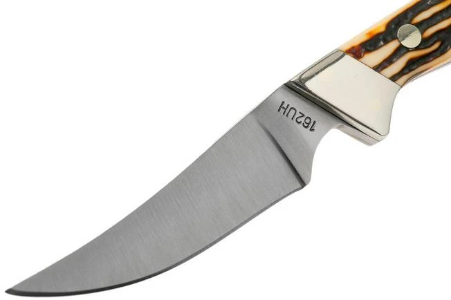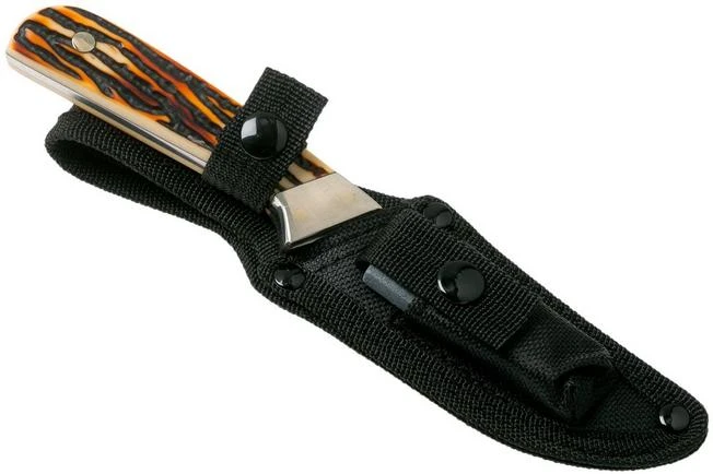 The Uncle Henry Wolverine 162UH is a compact hunting knife. Because of the finger groove placed in the front of the knife you can work nice and close on the edge. As such you can use the Uncle Henry Wolverine for many detailed tasks. The great thing about this version is that it comes with a free sharpening stone, you can find it in a pocket on the front of the sheath.