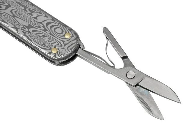 This Victorinox Classic SD Brilliant Damast is part of the Victorinox Classic Brilliant collection. Victorinox has gone all out with this series, with three chic versions of the beloved Classic SD as the result. This version has a handle made of beautiful damask steel of no less than 333 layers of steel with a beautiful Odin Heim pattern.
