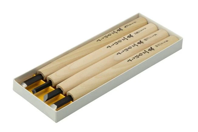 The Yoshiharu Y-4 Mitomoto set is a set of Japanese gouges. These gouges have a longer handle, so you can hold them like a pencil and work really precisely with them. They are typical, traditional Japanese gouges, made for making wood engravings. But they are also suitable for other forms of woodworking.